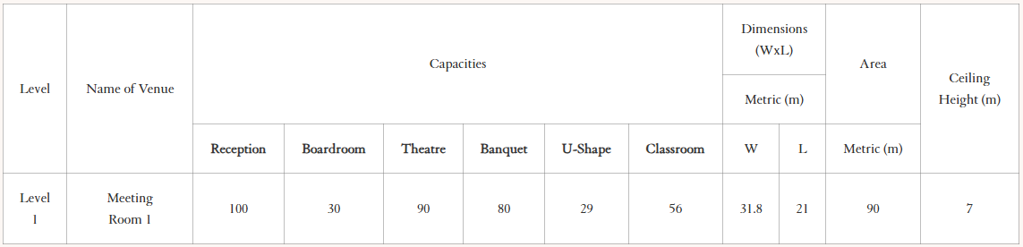 Reception Boardroom Theatre Banquet U-Shape Classroom W L Metric (m)